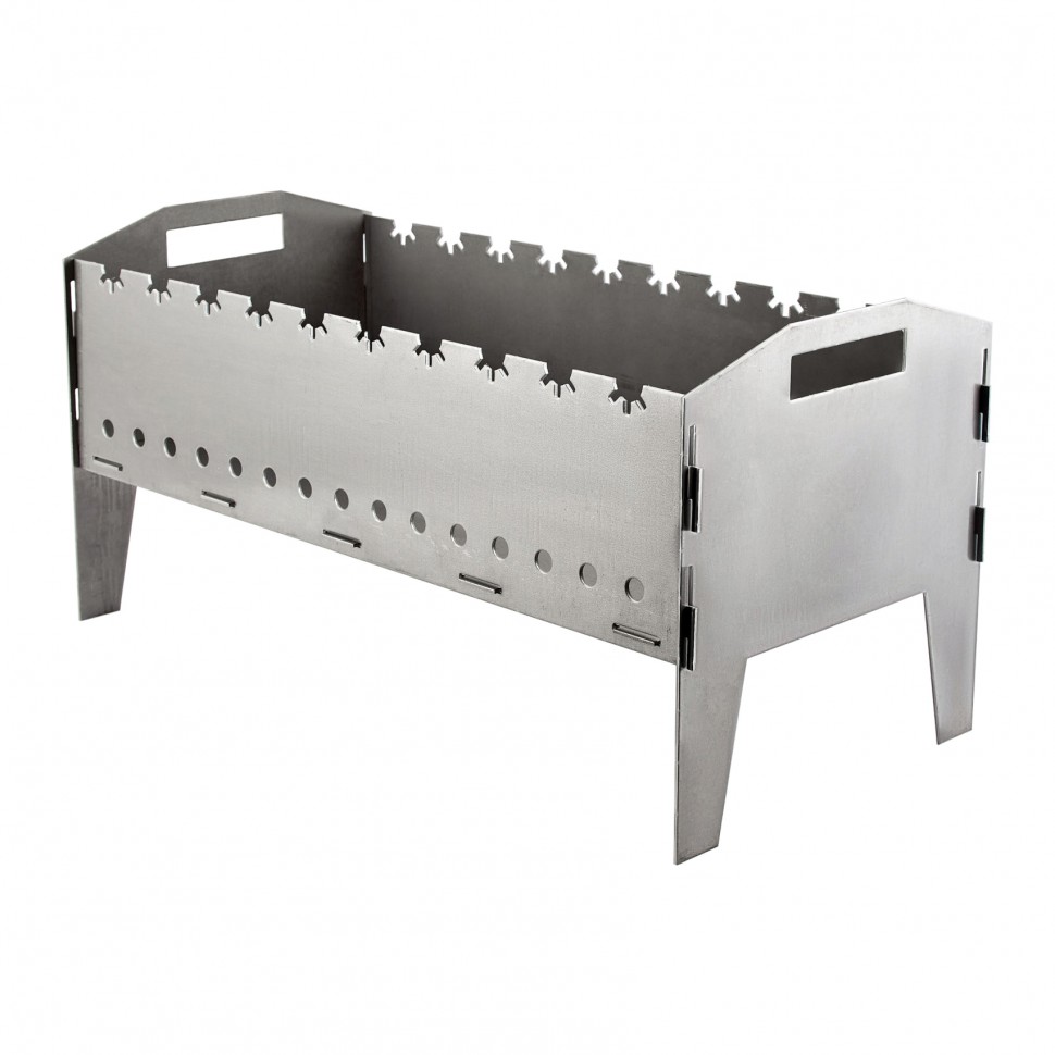 Быстро собирается и разбирается. Занимает мало места. Очень прочный. В прорезях сверху шампуры хорошо фиксируются. Они не будут крутиться сами по себе.
